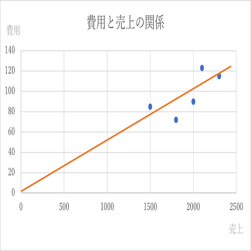 数値がなんとなく、なんとなくですがこの赤い線に沿って推移していることがわかりますでしょうか。というわけで、費用はだいたいこんな風に推移しており、費用と売上の関係性が見えてくる、というのがスキャッター・チャート法です。
